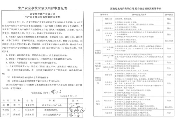 安全是大事,2020年,经发地产邀请市、区级安全生产专家,对公司办公、销售中心、施工现场各区域进行安全隐患检查,编制、完善专项《经发地产安全生产应急预案》,依据完善后的应急预案在各区域开展安全防范宣贯活动。