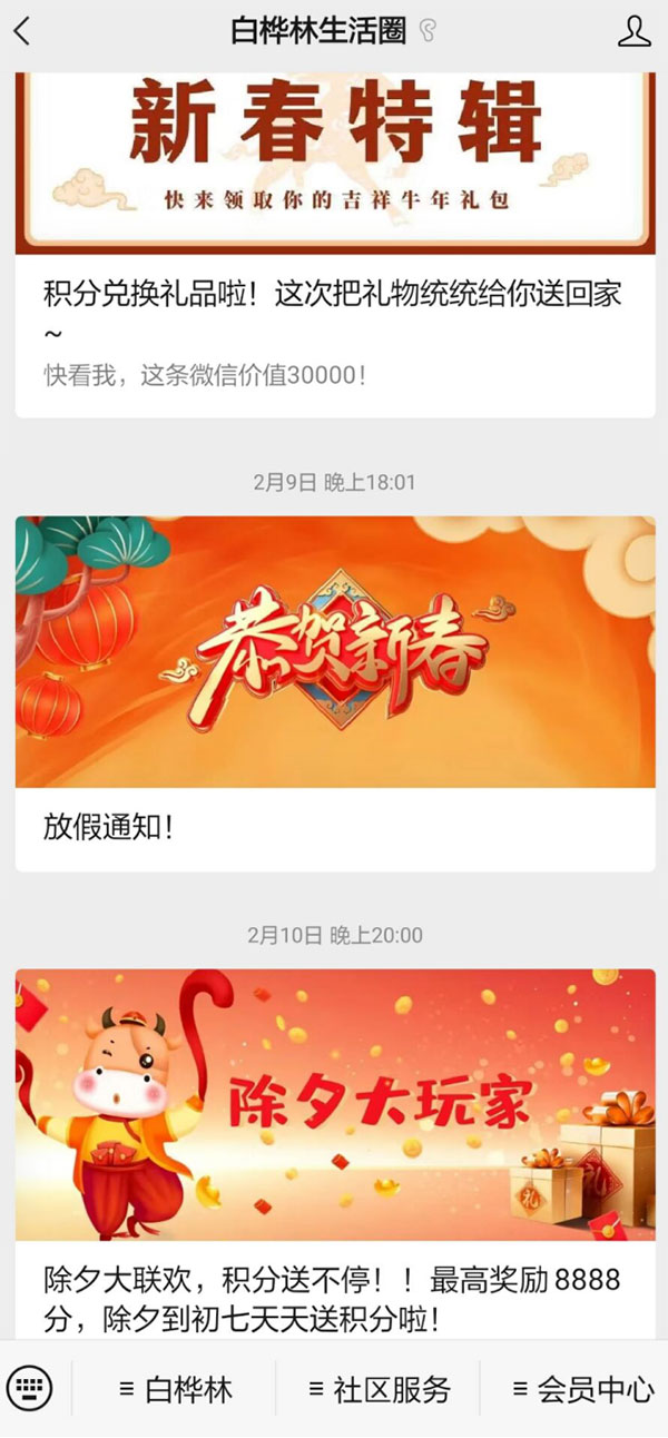 据悉,每逢新春期间,为提升客户对于经发地产品牌的黏性,同时答谢业主对平台的支持与关注,经发地产均会向关注白桦林生活圈公众号的业主们献上新年祝福及福利。活动以互动赢积分及积分兑换奖品为主,精心设置4款趣味游戏,参与最高可获得奖励8888分,并设30余款日常家用生活用品可供选择,大大吸引了众多业主的关注与参加,参与活动人数高达1000人次。除了此次线上积分兑换活动的以外,接下来在2021年里,白桦林生活圈更规划了众多多姿多彩的系列活动,如业主观影、生日礼赠祝福等,以让大家在活动中寻找乐趣、促进邻里感情,充分丰富业主的日常生活,塑造幸福和谐的社区氛围。