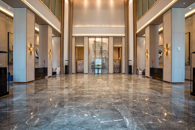 走进建筑,气派的单元入口以石材层层收口,出挑的坡屋顶勾勒完美天际线,金属格栅、壁柱和网格百叶默默传达出经发地产的细节注意,述说着如诗般的情感体验。