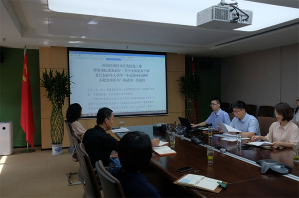 会议组织学习了习近平总书记来陕考察重要讲话精神:人民日报评论员文章:《绿水青山既是自然财富又是经济财富》、学习习近平总书记关于全面从严治党重要论述(摘录),传达学习《经开区党工委、管委会领导班子及其成员履行党风廉政建设主体责任清单》,市纪委办公厅《关于全市党员干部签订在招生入学中“不说情不打招呼不批条承诺书”的通知》、《关于4起违规收送礼金礼品问题典型案例的通报》。最后,还进行了视频学习,观看《公职人员政务处分法应知应会知识》。
