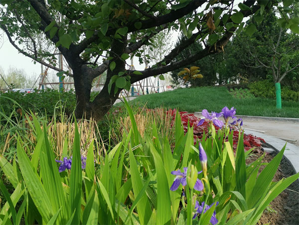 虽然还有部分工人在此施工,但是我们已经看到,在春日暖阳下,青草地、紫鸢尾和端庄沉稳的白桦林溪建筑互相映衬,成为高铁新城的靓丽风景线。